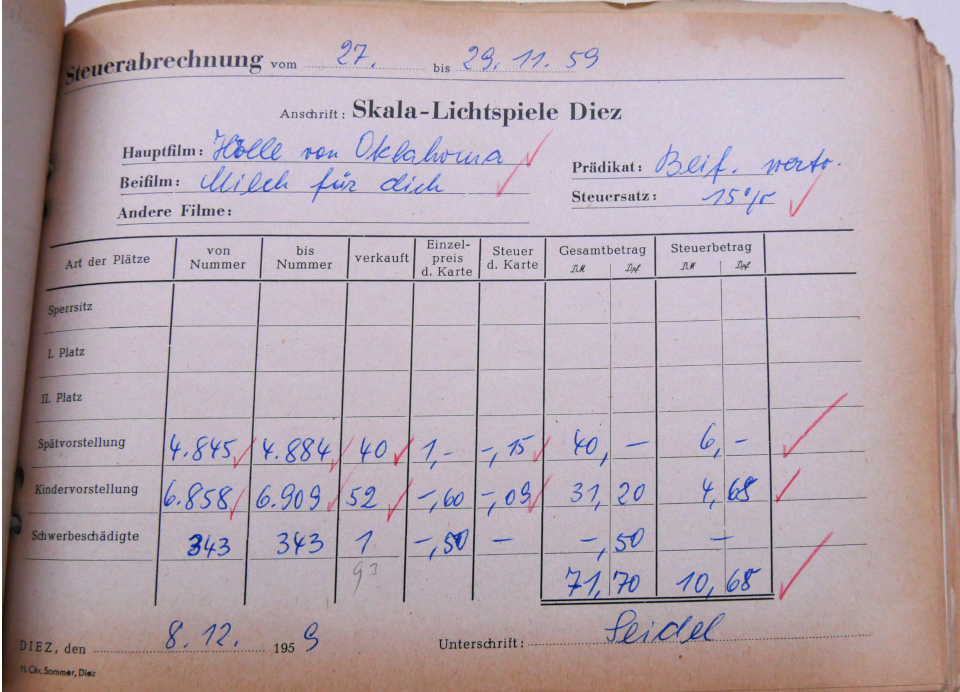 Vergnügungssteuerabrechnungen der Freiendiezer Skala-Lichtspiele, 1957-1960