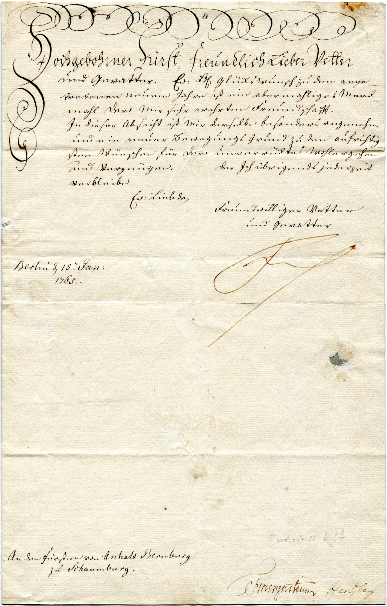 Neujahrsbrief Friedrichs II. von Preußen an den Fürsten von Schaumburg, 1765