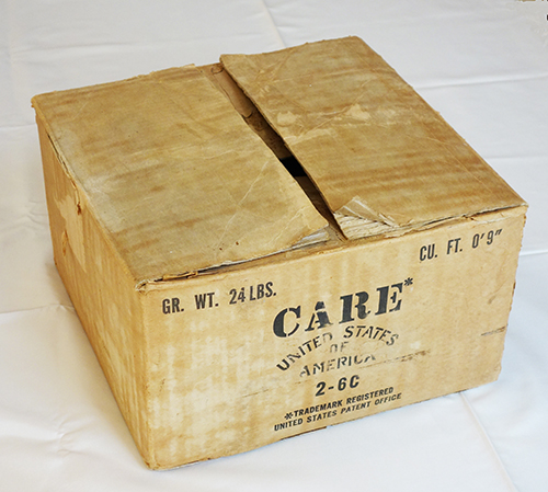 Das ausgestellte CARE-Paket ist ein spätes Exemplar. Laut Aufkleber wurde es am 23. Oktober 1958 in Ludwigsburg umgeladen. Es stammt aus dem Besitz des polnischen Ehepaars Rozalia und Polikarp Gasiorek in der Freiendiezer Weiherstraße, die im Krieg an verschiedenen Orten als Zwangsarbeiter hatten arbeiten müssen und sich nach Aufenthalten in Birlenbach und Hambach in Freiendiez niederließen. Das Paket ist bezeichnenderweise leer. Laut Aufdruck auf der Außenseite hatte der Inhalt des CARE-Pakets ein Gewicht von 24 amerikanischen Pfund, was knapp 11 kg entspricht.