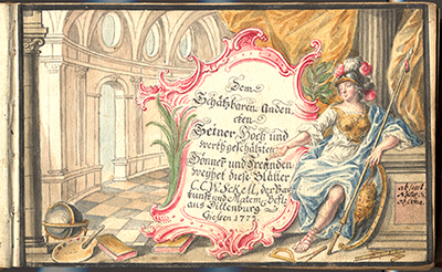 Es geht um ein querformatiges Buch mit 450 nummerierten Seiten und einem kurzen Verzeichnis der Einträge. In Lederdecken mit vergoldeten Ornamenten eingebunden, trägt es auf der Einbandmitte die Initialen C.C.W.S. Nach einem wild marmorierten Vorsatz und einem leeren Zwischenblatt folgt ein reich bemaltes Deckblatt, das Auskunft über den Eigentümer gibt. Inmitten eines barocken Schlossaales sieht man darauf Pallas Athene als Schirmherrin der Künste und Wissenschaften, umgeben von Winkel, Zirkel, Maßstab, Bücher, Palette und Globus als Symbolen für ihre Fachdisziplinen. Mit der rechten Hand weist sie auf eine von einem üppigen Zierrahmen („Kartusche‟) umgebene Schrifttafel. Deren Inschrift lautet: „Dem Schätzbaren Andencken Seiner hoch und werthgeschätzten Gönner und Freunden weyhet diese Blätter C.C.W. Sckell, der Baukunst und Matem. Befl. aus Dillenburg – Gießen 1773‟.