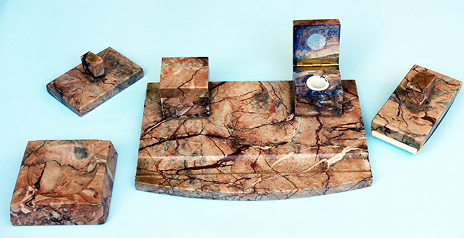 Zu einer Schenkung mehrerer Gegenstände von Seiten der ehemaligen Freiendiezerinnen Angelika Jansen und Friederike Bartel gehört eine mehrteilige Schreibgarnitur aus Lahnmarmor. Bestandteile sind zwei auf einer Ablageplatte montierte Tintenfässchen mit Deckel, eine Löschwiege, ein Briefbeschwerer und ein Aschenbecher – alles in allem ein nützliches, präzise gearbeitetes und dekoratives Ensemble.
