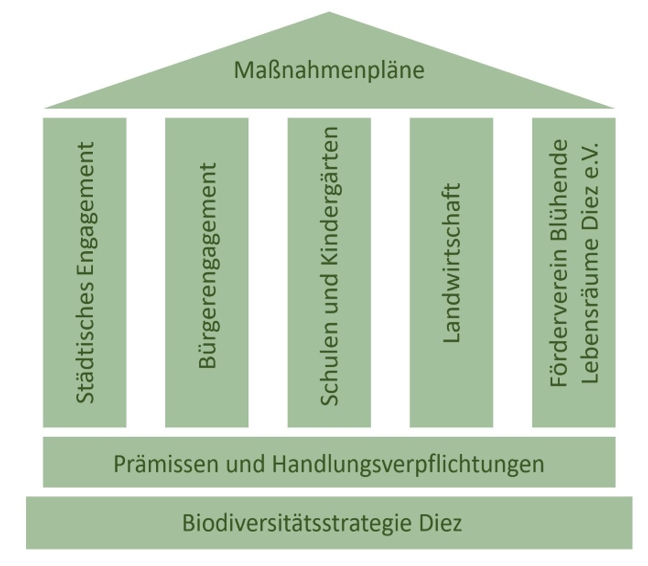 Vor diesem Hintergrund enthält die Biodiversitätsstrategie Diez Prämissen und Handlungsverpflichtungengen – sie bilden die Basis. Die als Säulen dieser Strategie bezeichneten Akteure bilden das tragende Gerüst. Und das Dach dieses Gebäudes gestalten die jährlich vom Stadtrat für das nächste Vegetationsjahr zu verabschiedenden Maßnahmenpläne. Für die Akteure werden Ziele beschrieben und Maßnahmen aufgezeigt, deren Realisierung sie ermöglichen oder unterstützen könnten/sollten. Aufgaben und Erfolge werden ihnen unmittelbar zugeschrieben. Damit stehen vor allem die Stadt, Schulen und Kindergärten sowie die Landwirtschaft und das bürgerschaftliche Engagement im Mittelpunkt der Betrachtung.